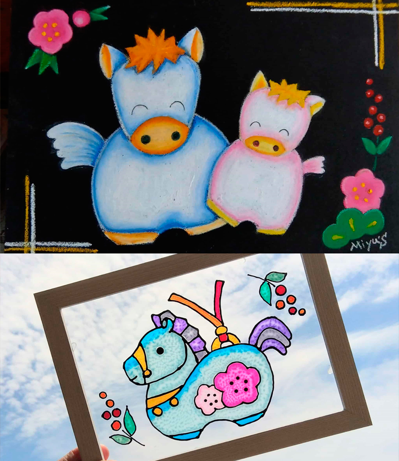 ■クラフト系:チョークアートorディンプルアートで干支(午)を描こう(体験料:2,000円) チョークアート:下絵付きの黒い板にクレパスの仲間で色を塗り、立体的な絵を完成させます。